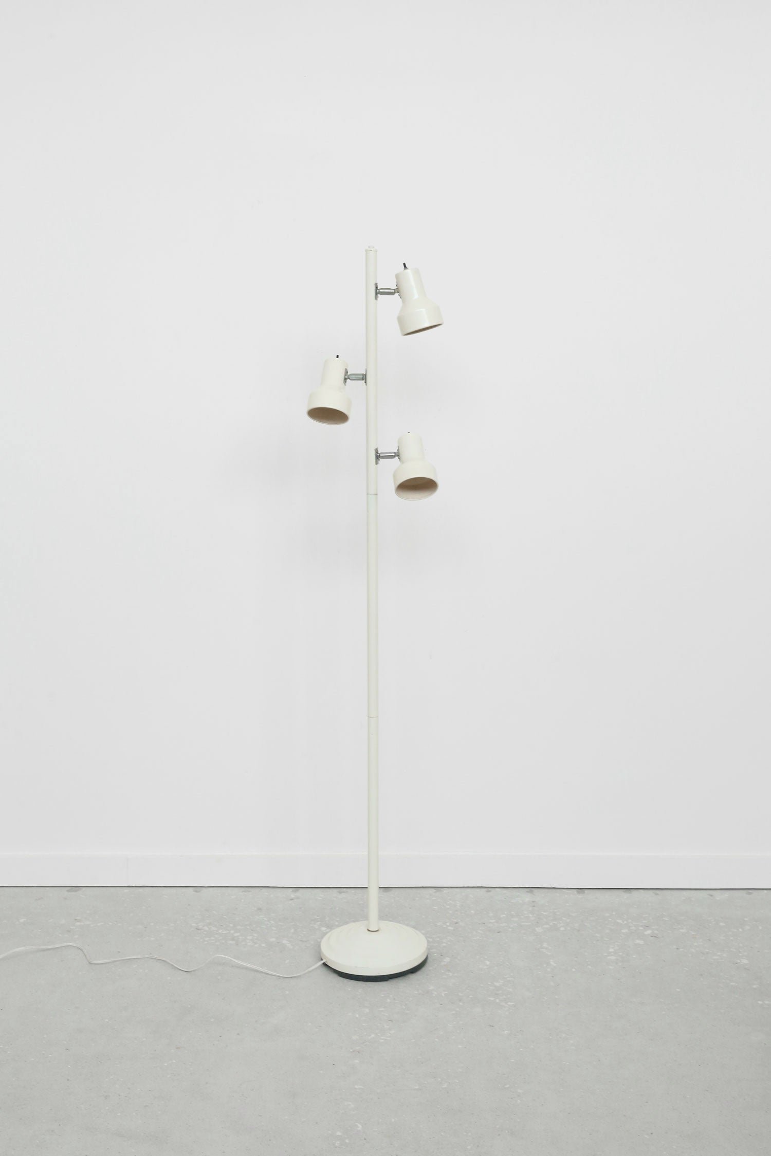 Cream-enameled floor lamp with three rotating spot heads and chrome hardware details. Clean lines, sculptural form, and flexible function in the spirit of Sonneman and Lightolier. Quietly modern, with a soft space-age edge.