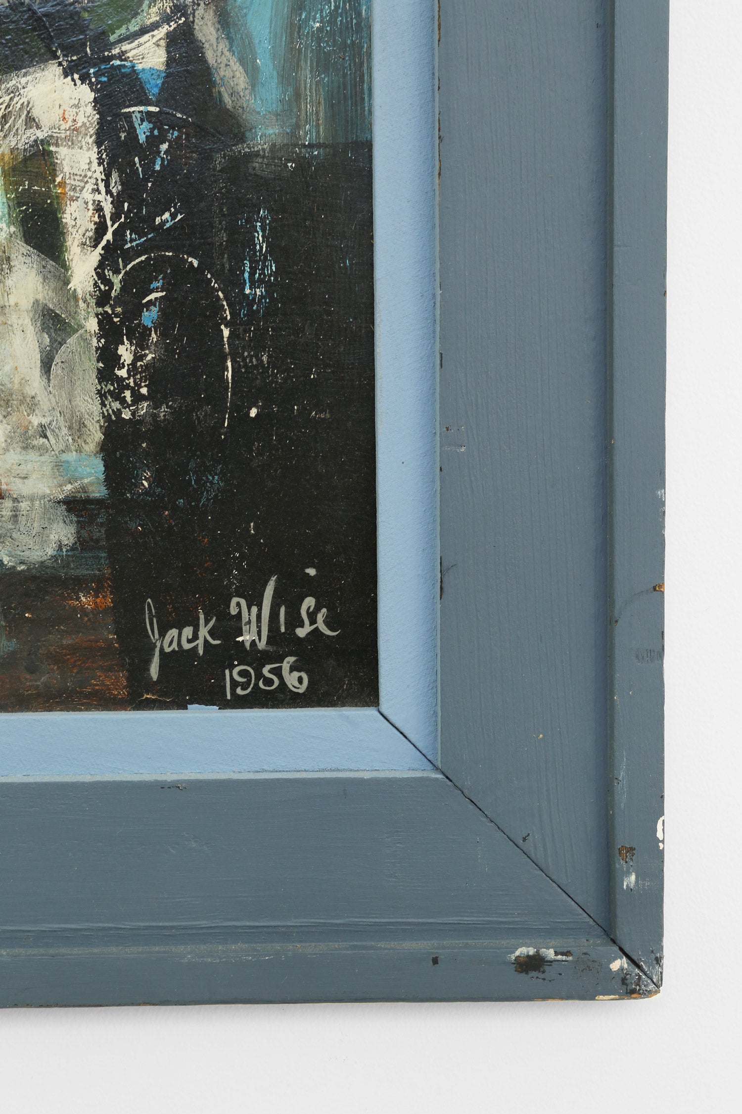 1956 abstract expressionist painting, signed by the artist, with a dense field of gestural strokes and layered pigment. The movement and mark-making echo the spirit of iconic mid-century modernists.