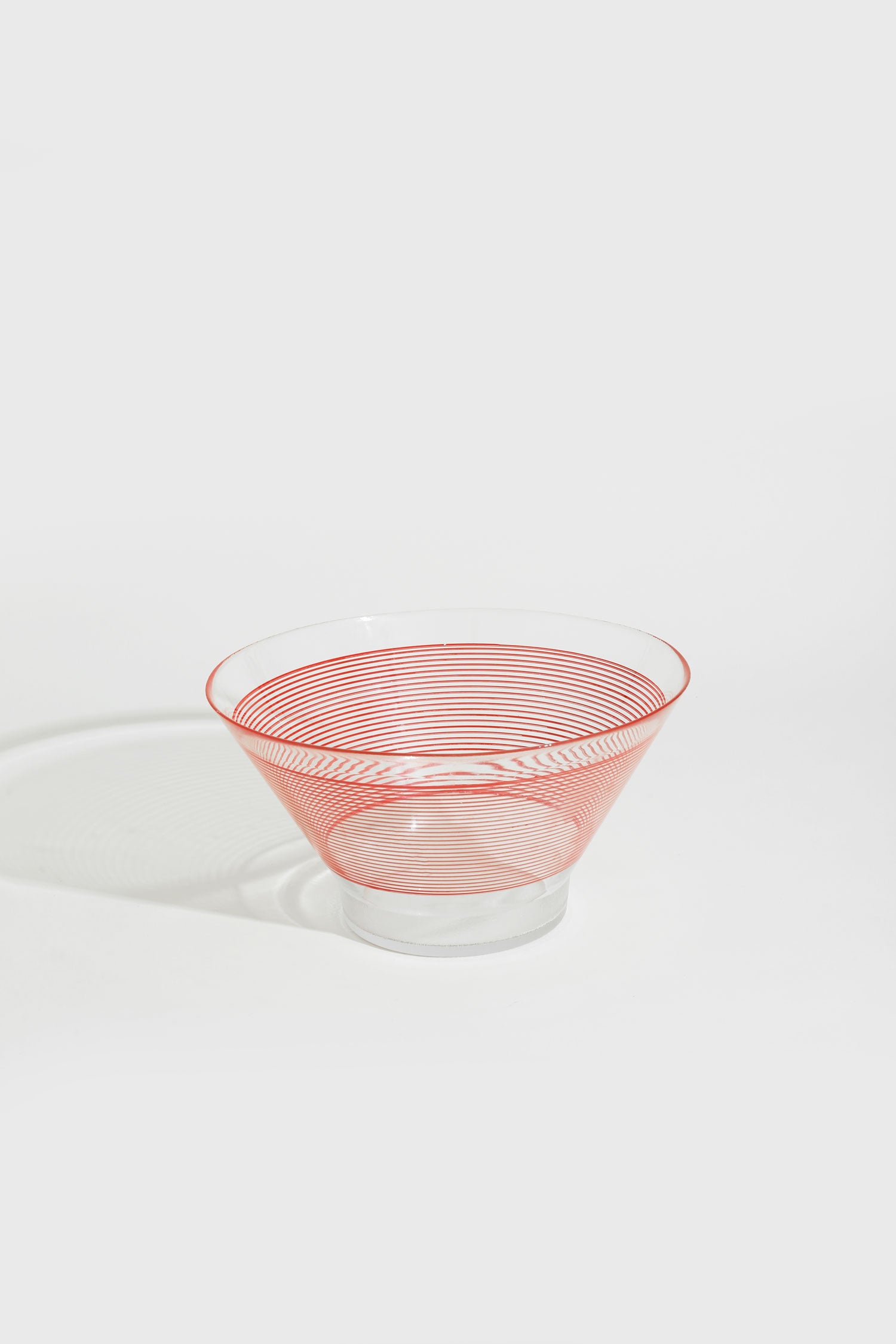 French glass bowl in the style of Veropa, featuring delicate red spiral lines within clear glass.