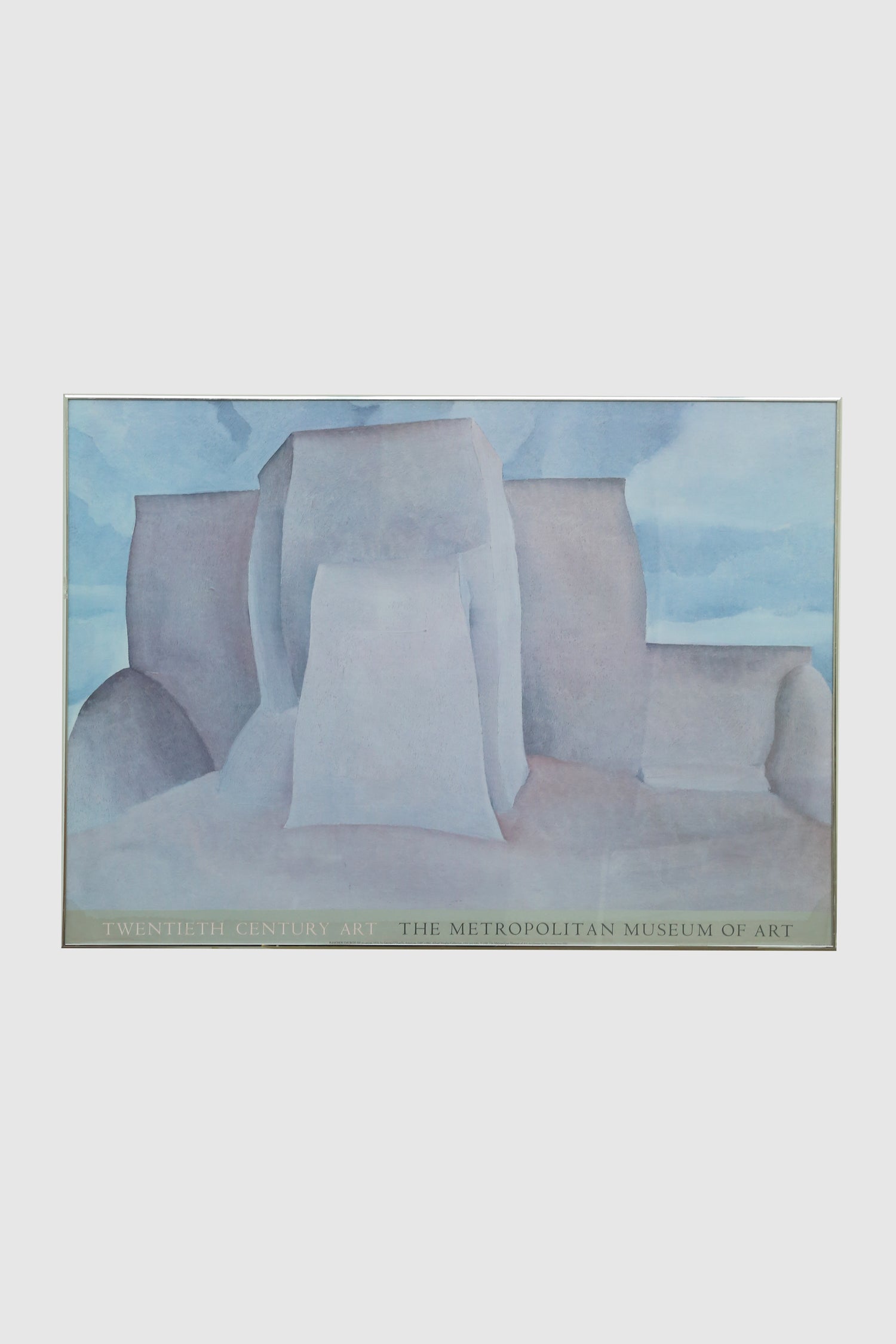 Exhibition poster of Ranchos Church by Georgia O'Keeffe. Published by The Metropolitan Museum of Art as part of their Twentieth Century Art series, 1987. There is a wire on the backside for wall hanging.