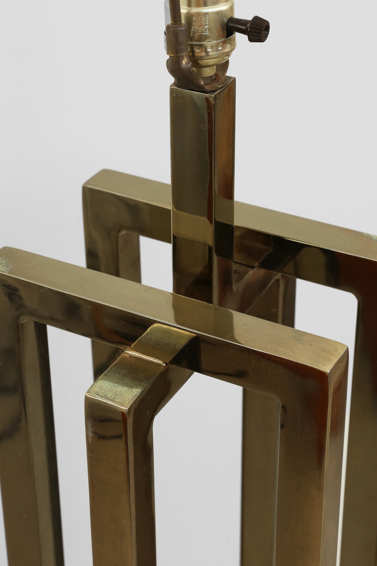 1970s brass column lamp with architectural frame in a Modernist Hollywood Regency style. A statement floor lamp with a warm, polished presence. Standard bulb. Lamp is in working condition.