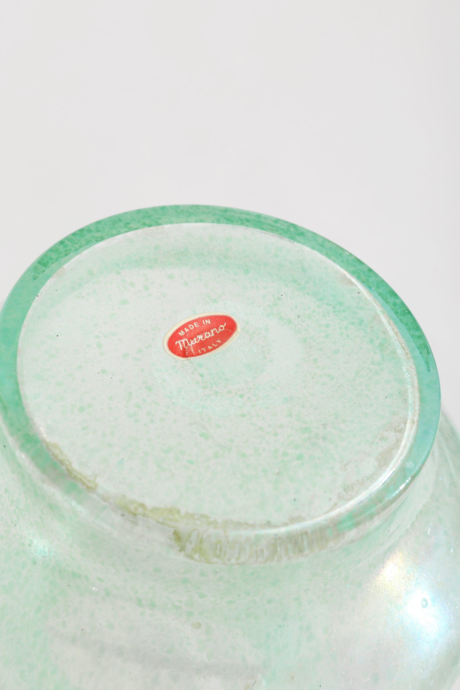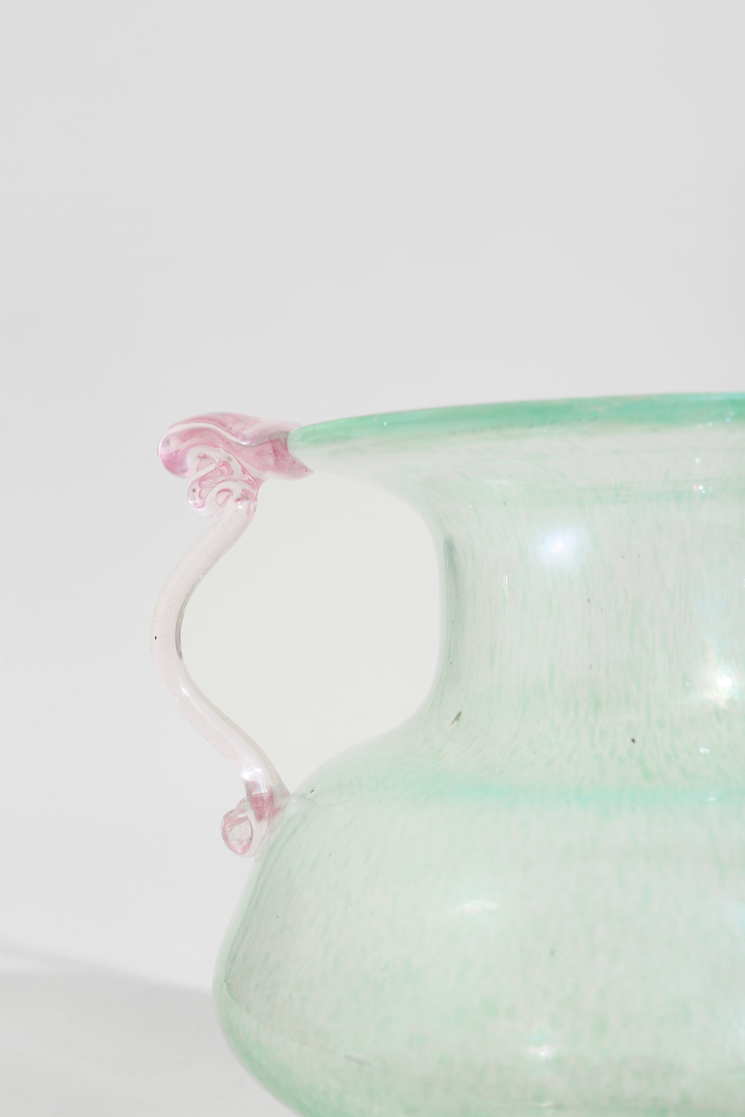 Murano glass vessel in a soft green tone with delicate blush handles. The rounded body and flared rim nod to classical form, while the subtle texture and romantic color pairing evoke mid-century Venetian glassmaking. Made by Murano, Italy and marked on the underside.