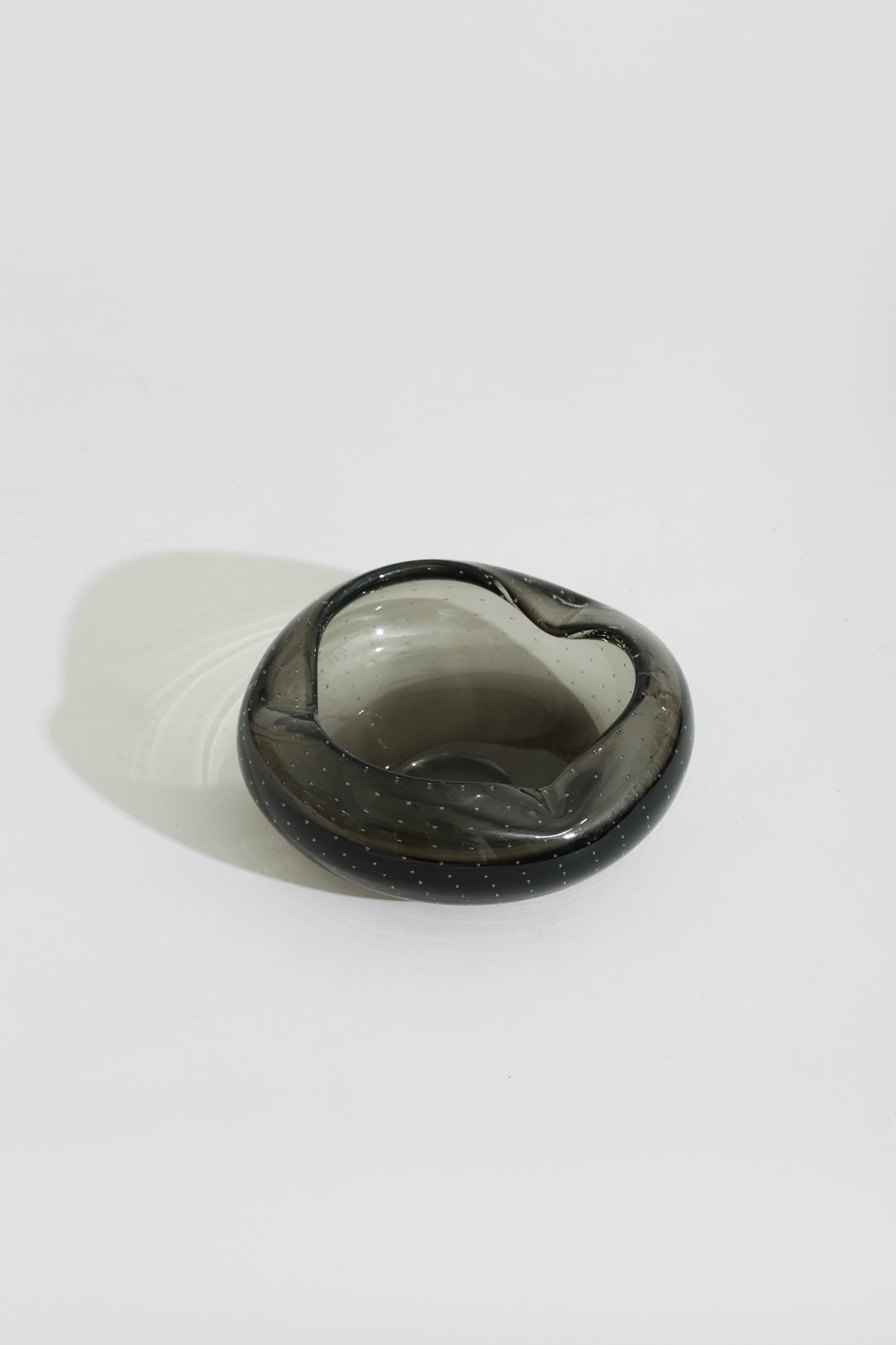 Weighted organic gray glass catchall / ashtray with dotted bubble detailing suspended throughout. Sculptural and tactile, it catches the light beautifully.