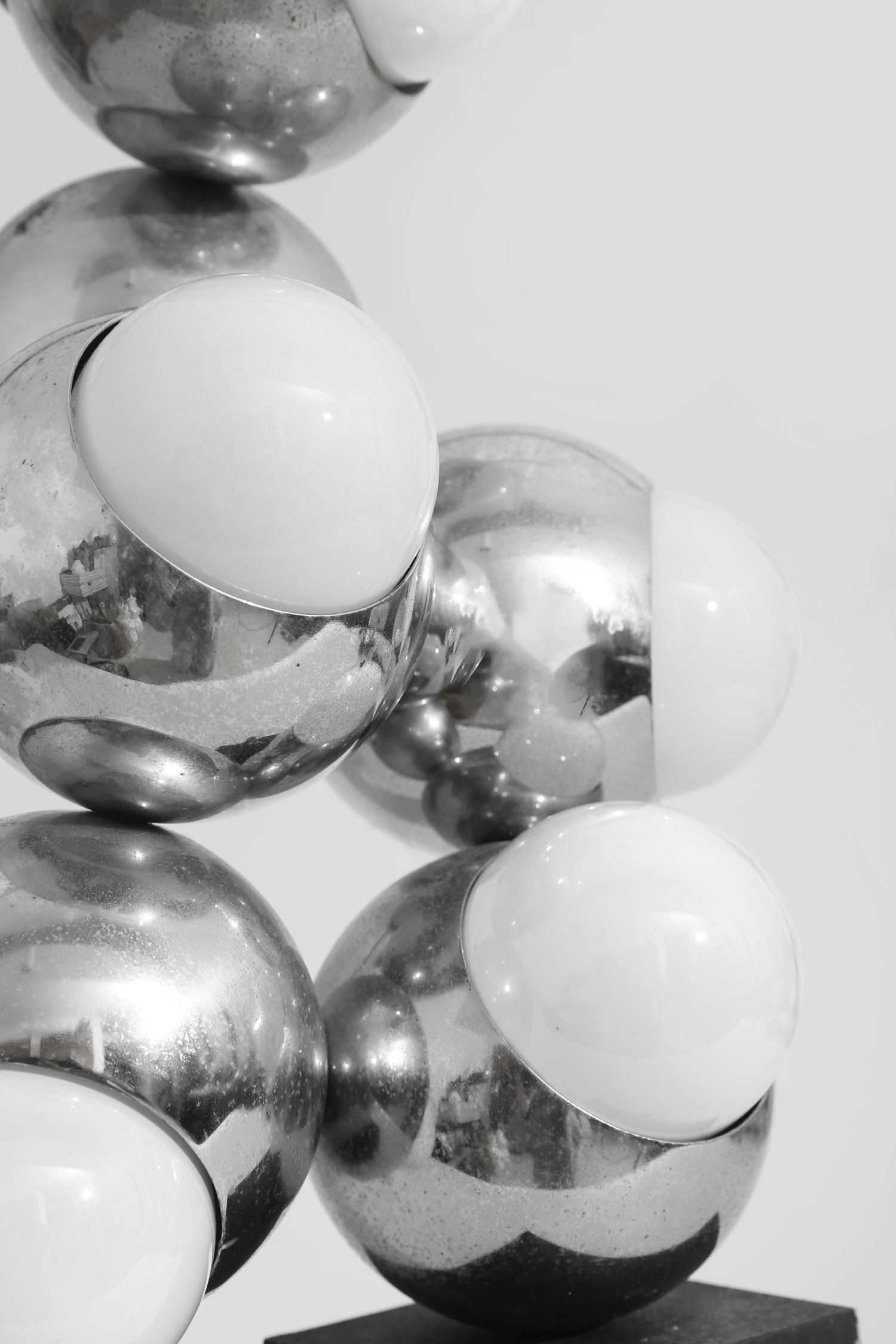 Space Age table lamp designed by Robert Sonneman. A sculptural cluster of chrome spheres set on a weighted rectangular pedestal base. The lamp offers a soft ambient glow and strong graphic presence. Lamp takes six bulbs. Lamp is in working condition.