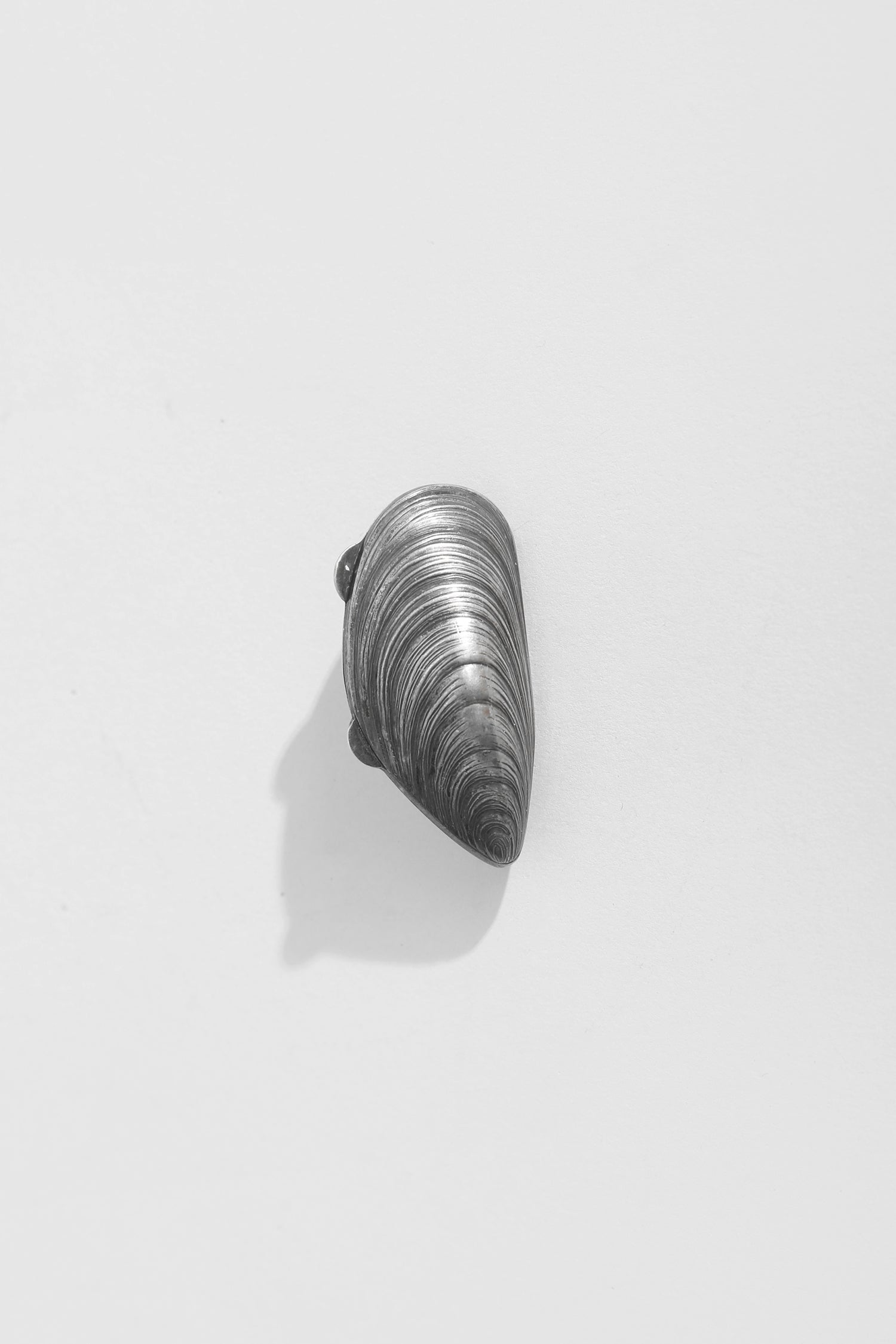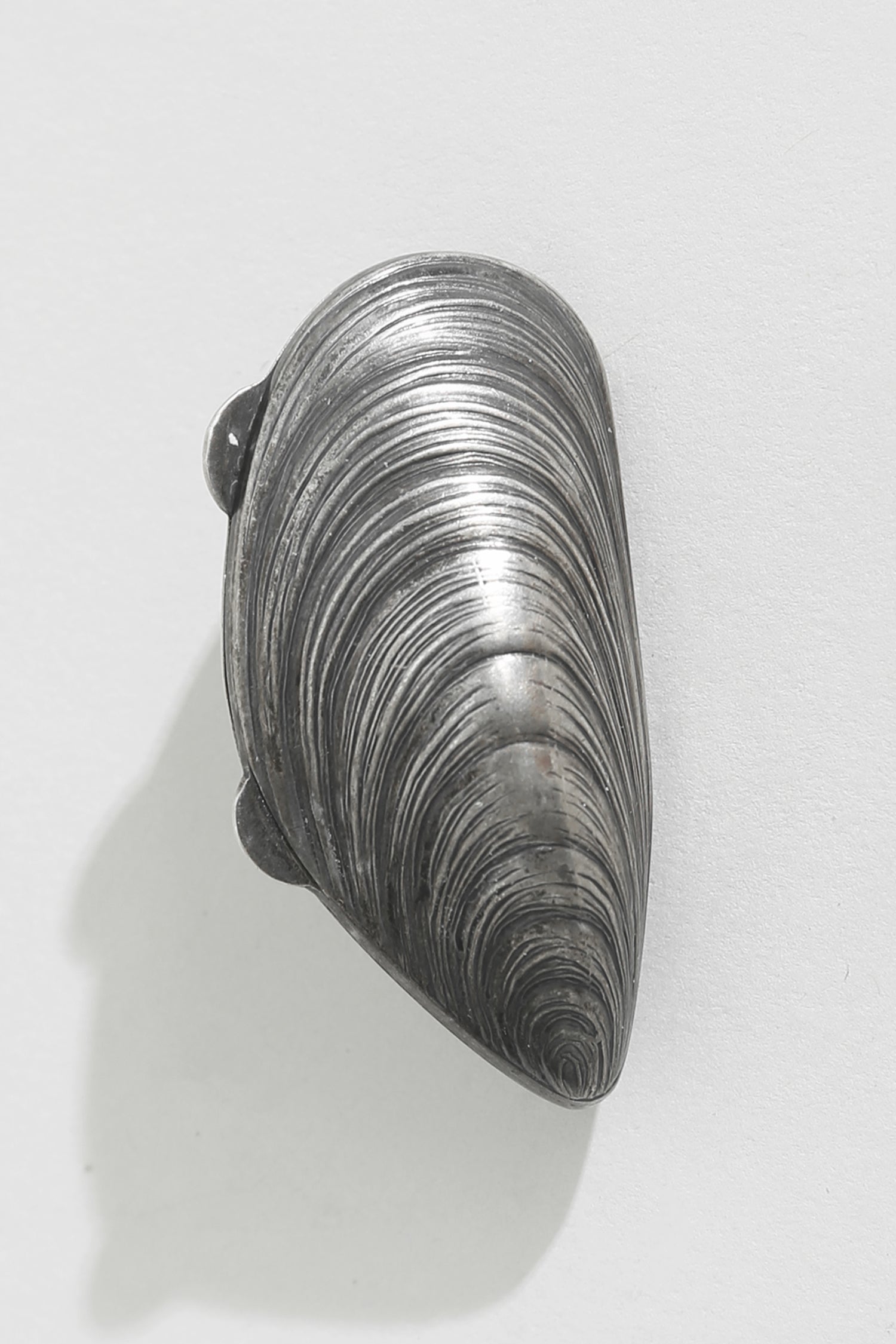 Silver-plated keepsake box in the form of a mussel shell. It has a hinged lid with a small interior for jewelry or trinkets.