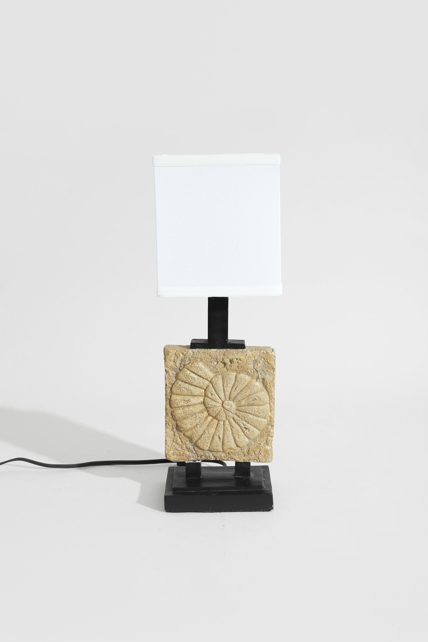 Table lamp featuring a carved stone block with nautilus relief with linen shade. A striking accent lamp—equally compelling lit or at rest. Standard bulb. Lamp is in working condition.