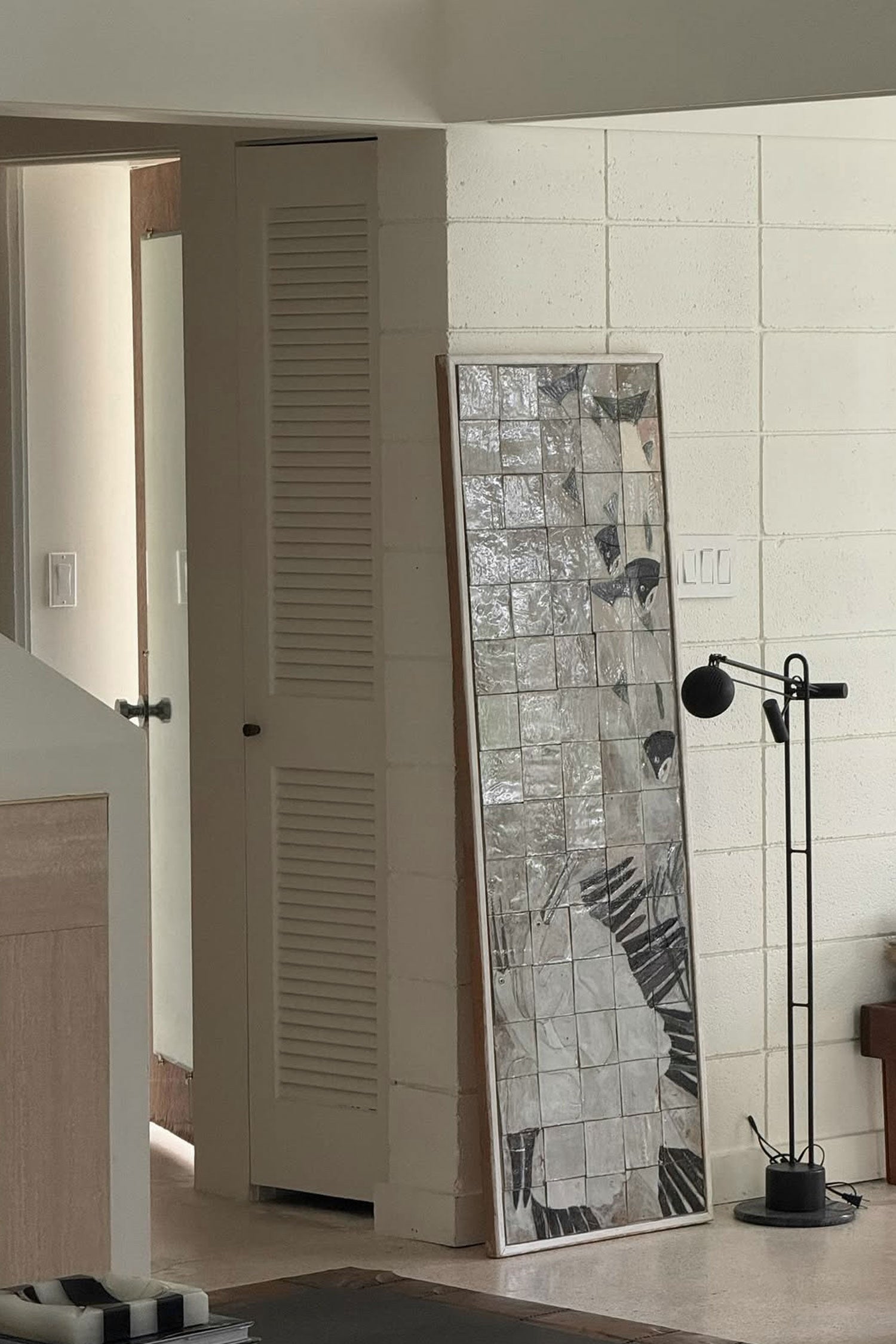 Large-scale ceramic tile mosaic depicting aquatic life in muted earth tones. Hand-glazed tiles with painterly texture and layered composition, merging artistry and architectural presence. Signed by the artist in bottom left corner, Ferrell. Artwork is framed in wood and is ready to hang with wire on the back.