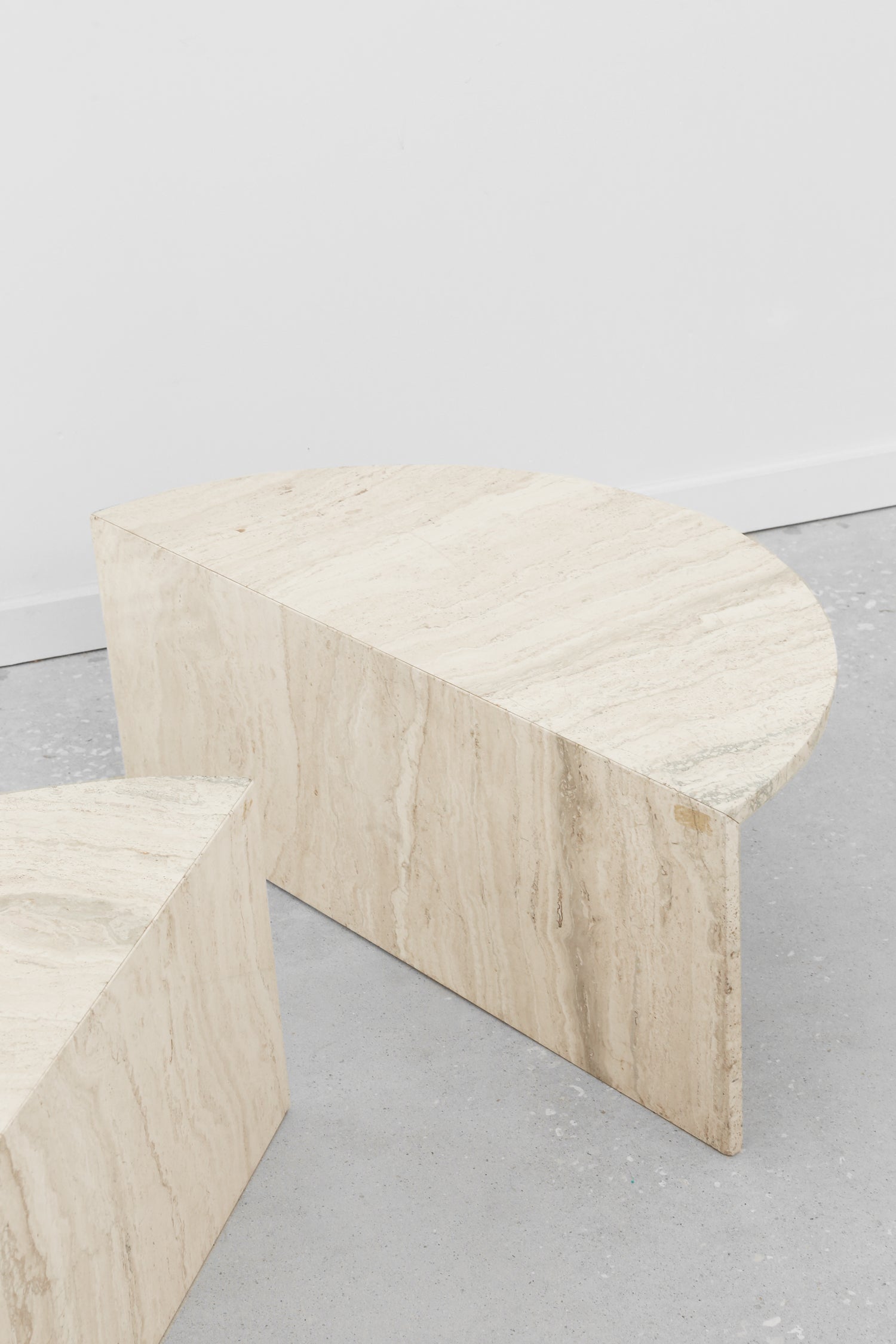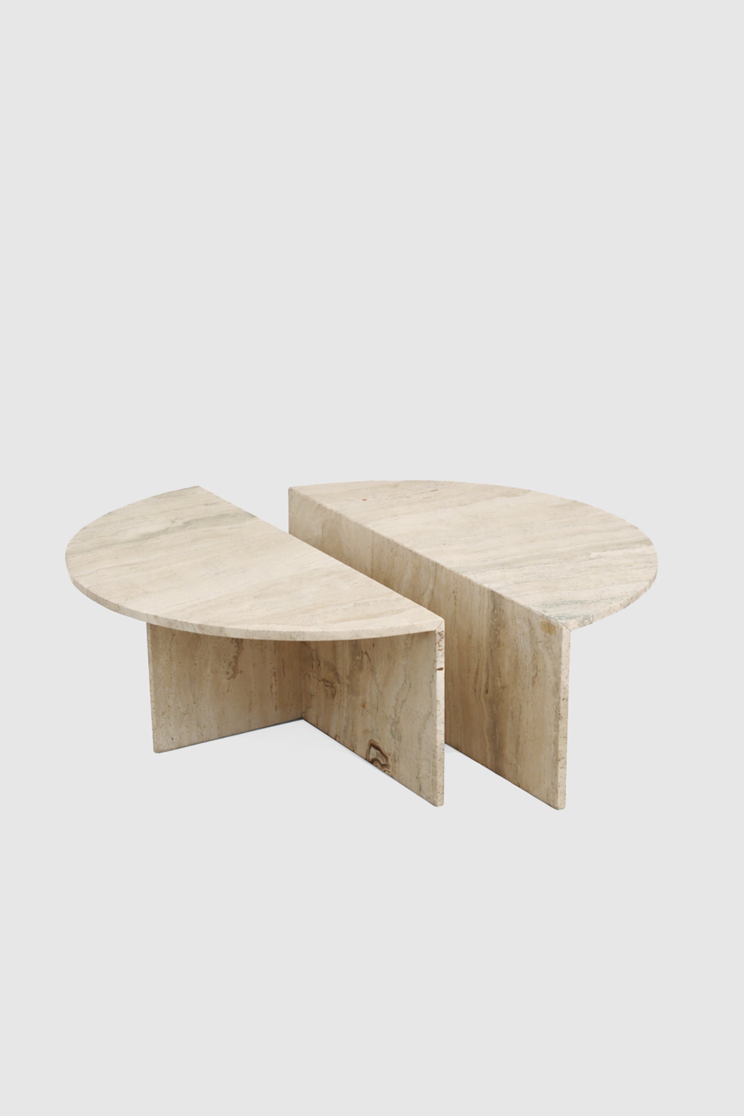 Vintage modular coffee table set in honed travertine. Two interlocking crescent forms that create a sculptural, graphic silhouette. The natural veining and tonal variation lend warmth and depth, while the split composition allows for flexible arrangement.