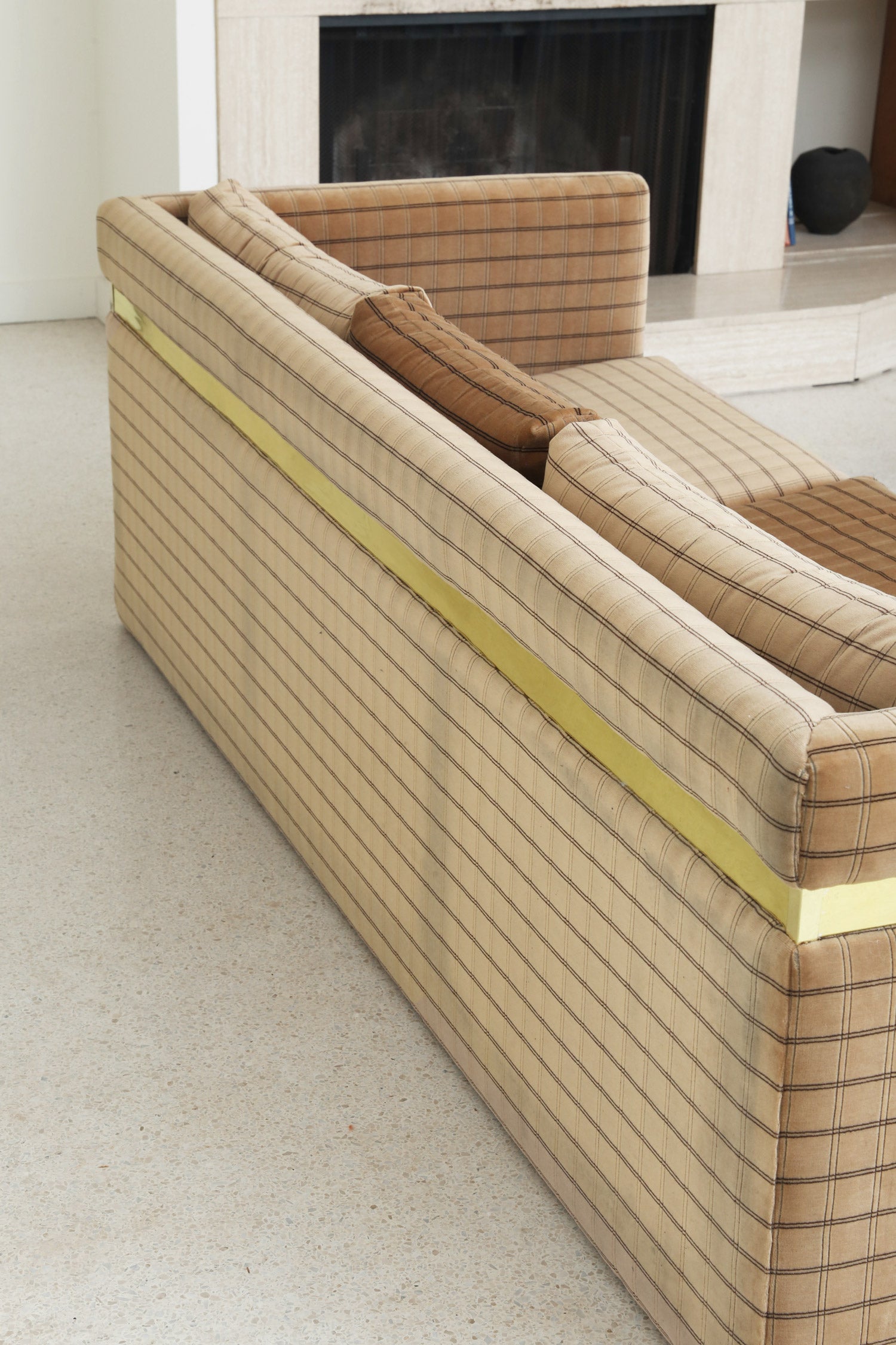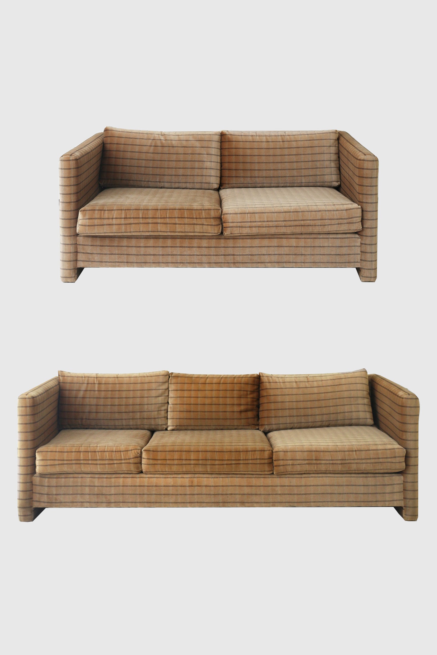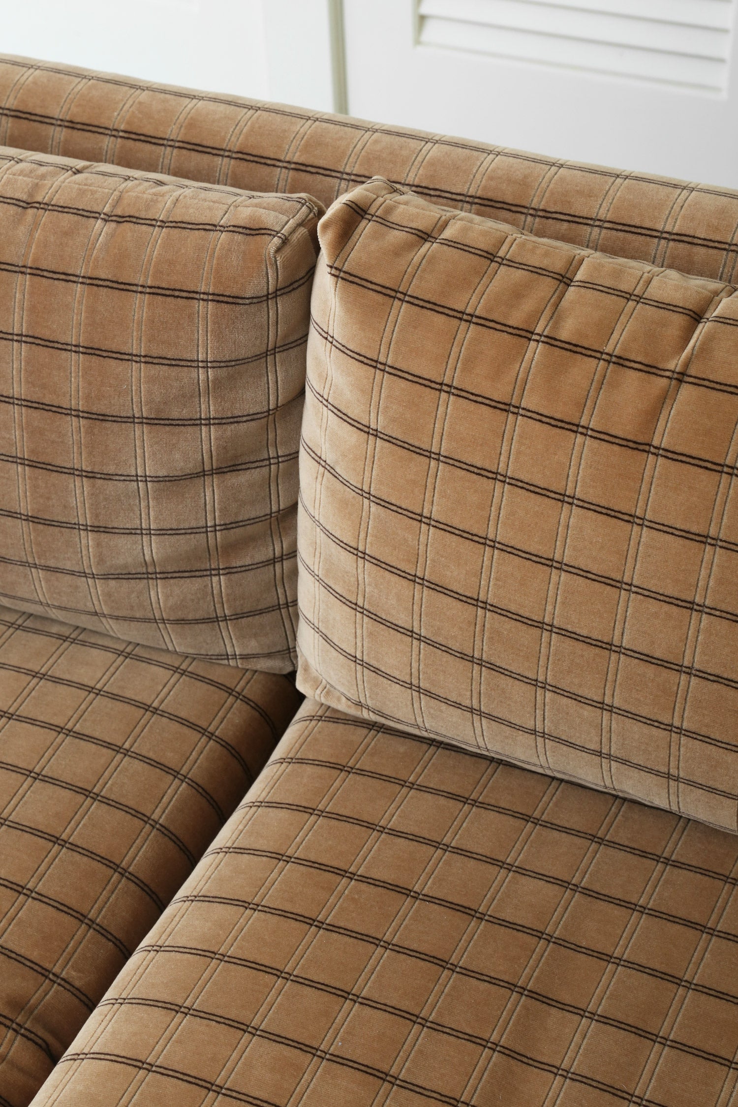 Rare 60/70s plush velvet sofa in a warm camel tone, featuring a subtle grid pattern that adds depth and structure. Made by Thomasville for their Founders Collection.